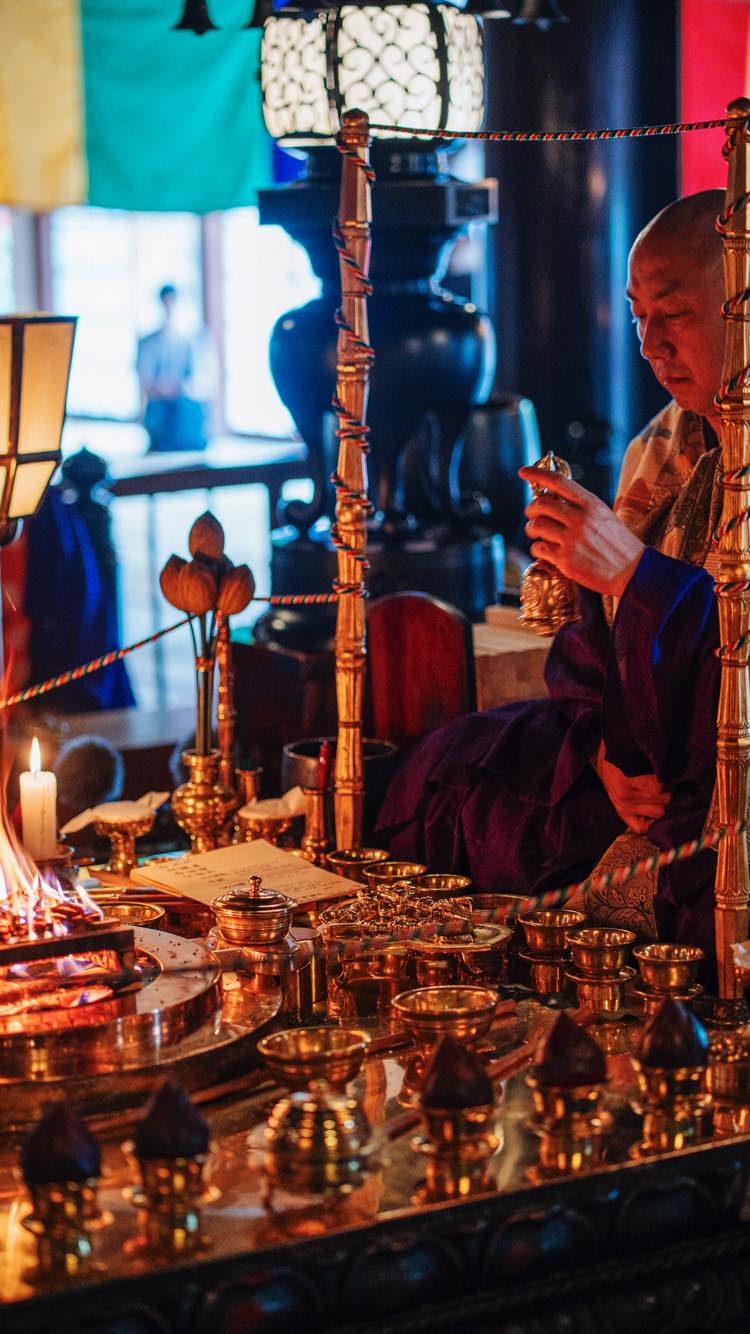 火の前に座る僧侶は、いくつかの供物を捧げて仏様をもてなし、
