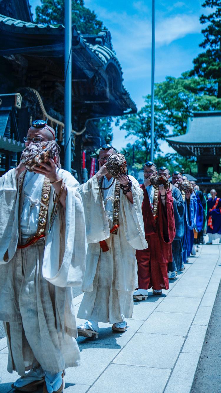 僧侶たちは、修験道の装束に身を包み、山の精霊と仏の力を一身に受けて、祈りを導きます。