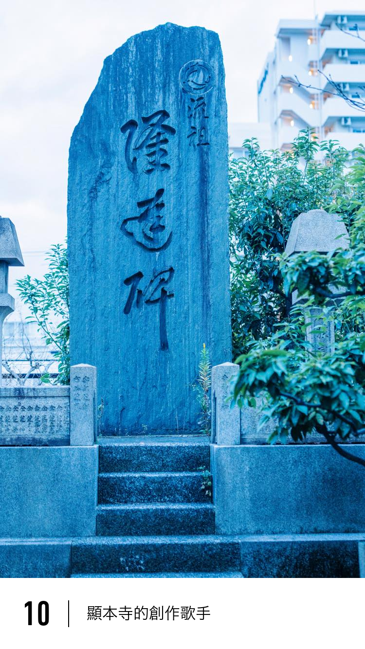 沿著利晶森林前的大街向東走,就是顯本寺。日本第一位創作型歌手高三隆達就安息於此。起源於堺市的三味線,是從琉球王國傳入的蛇皮樂器的改良版。堺市的三味線並非用難入手的蛇皮製作,而是用狗皮和貓皮製作。高三隆達作為僧侶,不僅會演奏三味線,還會自己作詞,並演唱帶有獨特旋律的短曲。 顯本寺所藏的畫作中,描繪了高三隆達如同一位流浪詩人般吟唱的場景。隆達如同一台點唱機,擁有超過500首歌曲,其中包括著名的《君之代》。如今,這首曲子被解釋為隱含著日本對天皇職位永久傳承的意思,但在當時,它實際上是一首情歌。