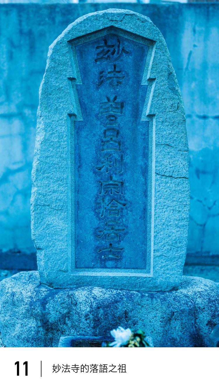 妙法寺內有落語之祖·曾呂利新左衛門的墓地。當時的堺市人才濟濟。“曾呂利”的名字源於他從事的刀鞘製作。曾呂利擅長製作刀鞘,無需測量長度,就能讓刀和鞘完美貼合,絲滑入鞘。這也表明,堺的工藝是分工合作的,各行各業都有專家。