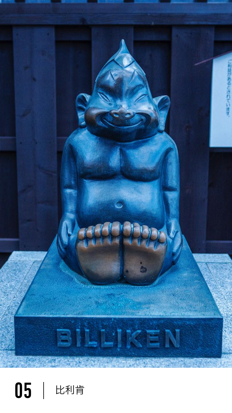 与田村有着深厚联系的吴服座附近,就有一尊比利肯像。据说,抚摸比利肯的脚底就能实现愿望。或许,你也能萌生出跟田村驹治郎一样的新创意!