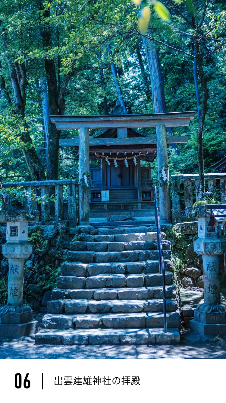 最後に、この場所で振り返ってみてください。そこに建つのは、出雲建雄神社の拝殿。かつて内山永久寺にあった建物を移築したもので、いまでは国宝に指定されています。静かに佇むこの拝殿にもまた、長い祈りの時が、静かに積み重なっているのです。