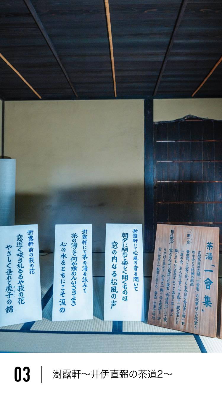 井伊直弼はこの茶室を「澍露軒」と名付けました。法華経の「甘露の法雨を澍ぎて、煩悩の焔を滅除す」からとったもので、雑念を捨て、茶道に打ち込む強い決意が表れています。また、この場所にもともと茶室はなく、直弼が自ら廊下の角を改造してつくったともいわれ、躙り口や床間もない質素な茶室から直弼の形にとらわれない精神が見て取れます。