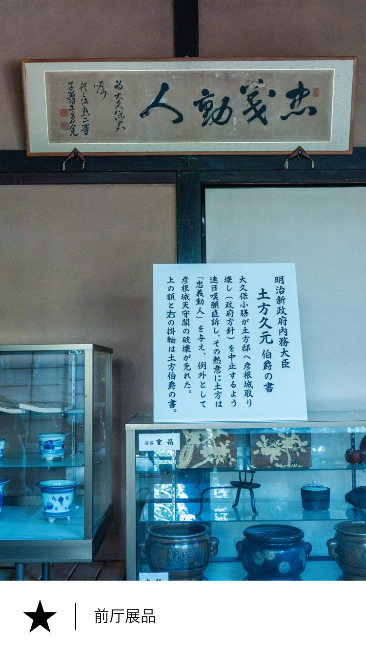 明治维新后,革命政府担心武士叛乱,在日本各地摧毁了城堡。彦根城也纳入其中。为此,大久保小膳每天早晨都会在当时的内务大臣土方久元(东京都文京区)的官邸门前下跪,恳求保护彦根城。最终,土方久元破例,借明治天皇巡视琵琶湖之机,邀请大隈重信视察彦根城,最终彦根城得以保存。随后,土方久元为了表彰大久保小膳对井伊家族和彦根藩的忠诚,赠予他一块匾额,还在匾额上亲笔书写下了“忠义动人”四个字。