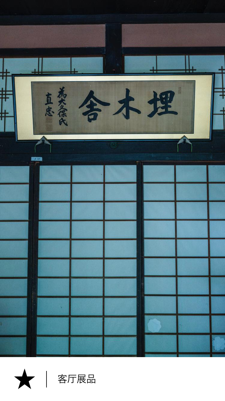 正面横梁上方的“埋木舍”字画框,是井伊直弼的孙子直忠赠予大久保小膳的亲笔题词。