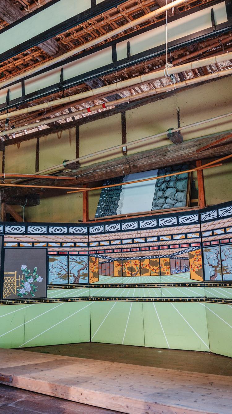 観客席は石を積んで築かれました。12段の桟敷は村の6地区に割り振られています。しかし、歌舞伎はいちばん前の特等席で見たいもの。そこで座席は毎年ローテーションで割り当てられ、公平が守られました。この工夫もまた、今に伝わる伝統のひとつです。