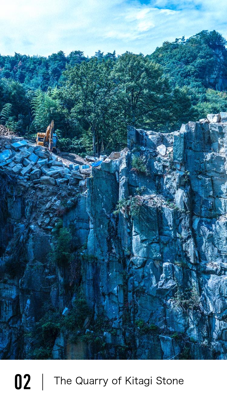 The granite extracted here was known as Kitagi-ishi, or Kitagi stone. It has a fine texture and is known for being resistant to impact. In the past, it was used for the walls guarding the front gate of Osaka Castle. The front gates were the most likely place for enemies to attack, so Kitagi-ishi were chosen to be the main component of the supporting structures on either side.