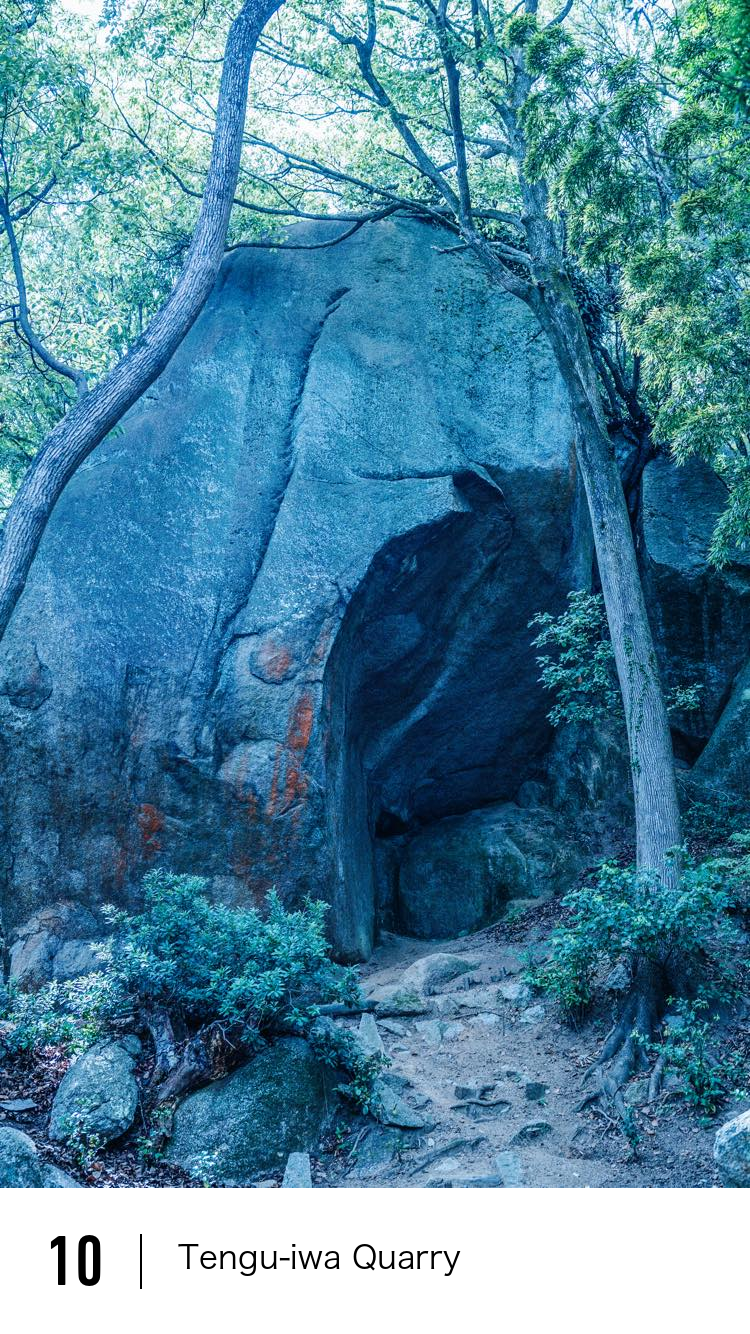 There is a massive boulder standing before you, which is known as Tengu-iwa. At 17 meters tall, it is said to weigh 1,700 tons. This massive rock has no signs of any carving or excavation. Why had no one touched it? Perhaps the stonemasons had been in awe of this boulder, recognizing that they couldn’t move it on their own. Along with its countless ya-ana, the Tengu-iwa Quarry continues to hold mysteries that may never be solved.