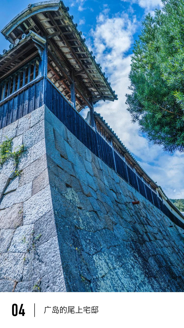 石墙之上是尾上家族的宅邸,尾上家族曾是航运贸易批发商,生意做的非常大。这座宅邸建于江户时代(1603年-1868年)后期,由被称为“盐饱大工”的工匠,全部使用榉木木材精心打造而成。他们继承了,由岛民组成的海上武装“盐饱水军”的造船技艺,并将实用性与美观完美结合。例如:将船舶滑轮的原理应用于窗户的开关。