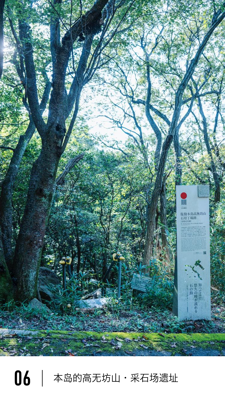 高无坊山,耸立于本岛北部。山脊上遍布被刮削过的岩壁,昔日采石场的遗迹静静地留存于此。这片采石场曾由名为细川家族的大名(封建领主)掌管。数百名规模的石匠组成团队分工合作,开采石料。时至今日,山坡上仍留有很多叫“矢穴”的孔洞,那是楔子插入孔中留下的痕迹。这些“矢穴”是一种劈石技术。首先,用凿子挖出一个洞,然后将木楔或铁楔插入洞中后慢慢敲击。当石头上出现裂缝后,就能把一块巨大的石块从山体上分离出来。不难想象,昔日的采石景象。