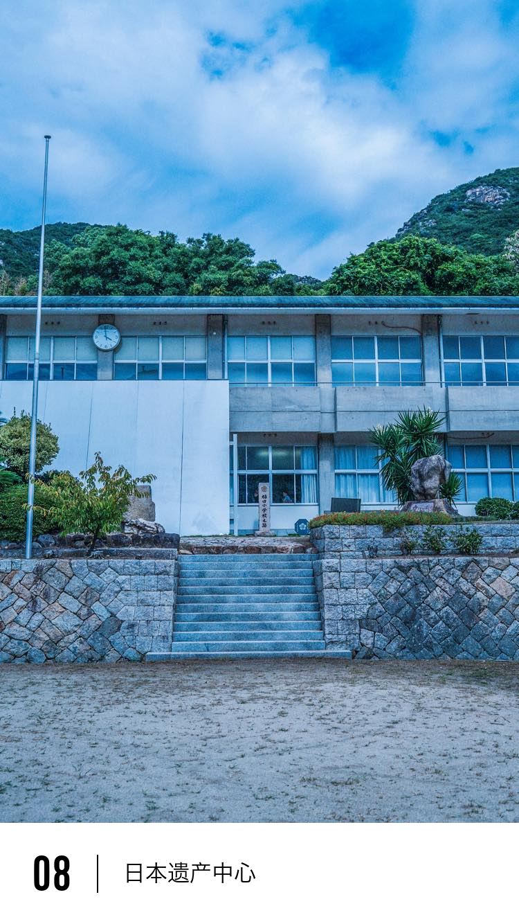 这栋建筑原是一所小学。从校舍的外观,可以看到小豆岛的石头被广泛使用,而开采这种石材的山峰就耸立在学校正前方。孩子们从小就听着石头被敲击的声音长大。