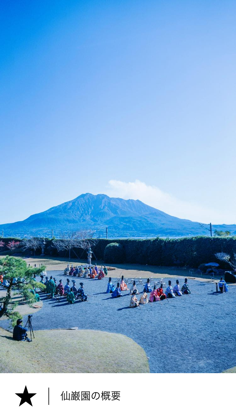 仙巌園は、江戸時代初期にあたる万治元年(1658)、19代島津光久によって築かれた別邸です。桜島と鹿児島湾を借景として庭の景観に取り入れ、望嶽楼、千尋巌、曲水庭、江南竹林など中国文化の影響がみられる点を特徴とします。歴代当主たちの安らぎの場として愛され、時には国内外の要人をもてなす迎賓館の役割も果たし、幕末期の外交史において重要な舞台の一つになりました。