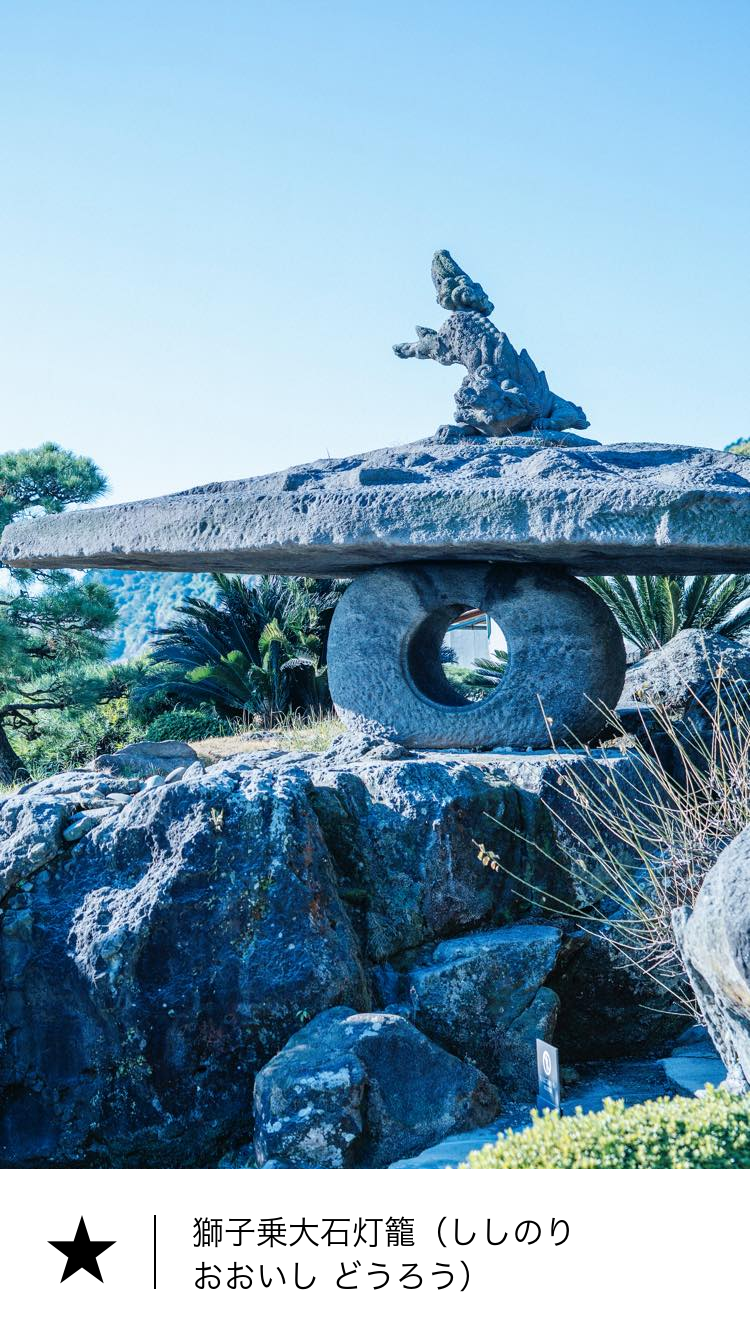 明治17年(1884)に29代島津忠義が、庭師の小田喜三次に造らせたものです。灯籠として園内一の大きさを誇り、8畳程もある笠石の上には、桜島から大空を翔ける勇ましい姿の「飛び獅子」が乗せられています。この獅子と火袋石は、もともと花倉御仮屋にあったものと伝わり、笠石は磯海岸から運ばれたとされています。