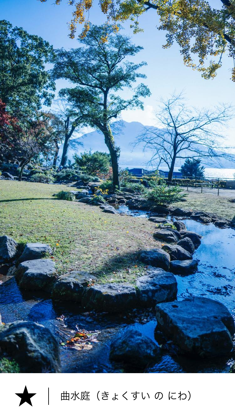 仙巌園の曲水庭は、21代島津吉貴の時代のものと考えられています。吉貴は、元文年間に中国原産の孟宗竹を琉球経由で取り寄せ、仙巌園に移植しました。これは曲水宴として有名な中国・蘭亭を意識したものと思われ、仙巌園の曲水庭も孟宗竹を取り入れた時期に前後して築庭したものと考えられています。