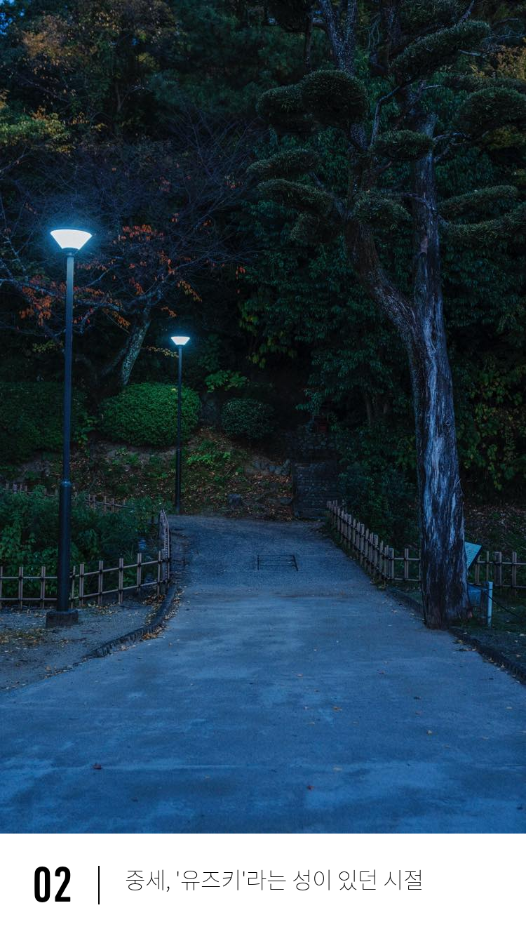 그 뒤 유즈키성에는 새로운 성주가 들어왔지만 그들은 다른 곳으로 본거지를 옮겼습니다. 에도 시대가 되어 마츠야마성이 축성될 무렵에는 유즈키성의 석축이 옮겨졌다는 전설도 전해지며, 이 언덕은 대나무 숲으로 덮이게 됩니다.