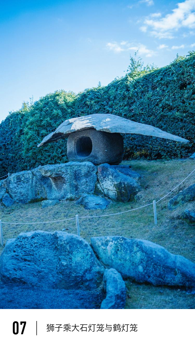 庭园内看点众多,首先是这里的两个石灯笼。一个是花园中最大的灯笼“狮子乘大石灯笼”。它的盖石足有8张榻榻米那么大(约13平方米)。灯笼顶上的狮子栩栩如生,仿佛即将展翅飞向天空,气势磅礴。