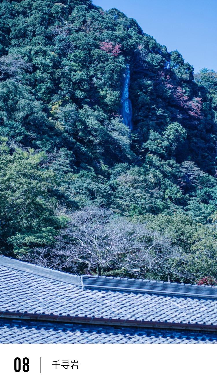 从这里抬头望向山峰,就能看到刻在岩壁上的三个汉字。这三个汉字加起来大约有11米高,非常大。即使从远处也能清晰可见。从上到下,这三个字分别是汉字的数字“千”、汉字的“寻”以及汉字的“岩”,因此被称为“千寻岩”。