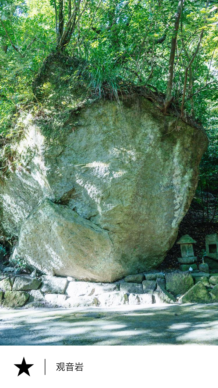 这里是据传建于元禄十六年(1703年)的观音礼拜所遗址。岩石上刻有代表观音菩萨的梵字。 有一种说法认为,这是因岛津家第20代当主纲贵的正室鹤姬之愿,为悼念在赤穗事件(赤穗浪士讨伐事件)中被杀的父亲吉良上野介而建。然而,根据记载,延宝三年(1675年)嫁入岛津家的鹤姬,在五年后回吉良家省亲后突然提出离婚。尽管夫妻之间并无不和,岛津家虽感困惑,仍接受了这一请求。由于两人关系在元禄元年(1688年)时已解除,因此这一传说与史实之间存在出入。