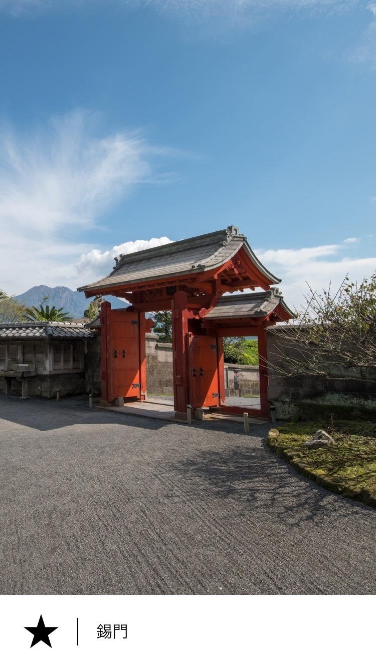 據傳,這座正門是由建造仙巖園的島津家第19代當主光久在位時期建造的。 之所以被稱為“錫門”,是因為它的屋頂瓦片是用錫製成的。 過去,只有島津家的當主及其子嗣才能通過這座正門。 島津家第25代當主重豪委託繪製的《仙巖園十六景》中描繪了一個名為“舌出”的碼頭,這表明當時的當主會從鹿兒島城下乘船前往仙巖園。 錫,原本在日本並不常見。然而在江戶時代,薩摩藩相比盛產錫,產量位居日本之首。錫門的屋頂瓦使用錫的原因之一是,錫曾是薩摩的特產。