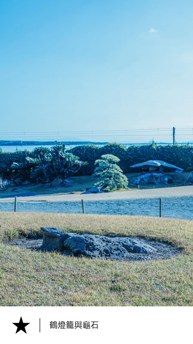 具有異域風情的仙巖園,以其獨特的石燈籠和庭園石而聞名。這些石燈籠和庭園石,融入了中國古代的理想之鄉“蓬萊山”的理念。蓬萊山的理念傳入日本後,就有了松竹梅的概念,後演變為鶴龜棲息的景象並最終定型。 下庭中的燈籠,因蓋石形似一隻展開雙翼的鶴被稱為“鶴燈籠”。1857年(安政4年),島津家第28代當主齊彬曾進行過一項實驗,他將自家莊園內煤氣室的煤氣管道連接到燈籠上並點亮了石燈。 屋久種子五葉松樹下的庭園石,因形似一隻從錦江灣中爬出來的烏龜被稱為“龜石”。