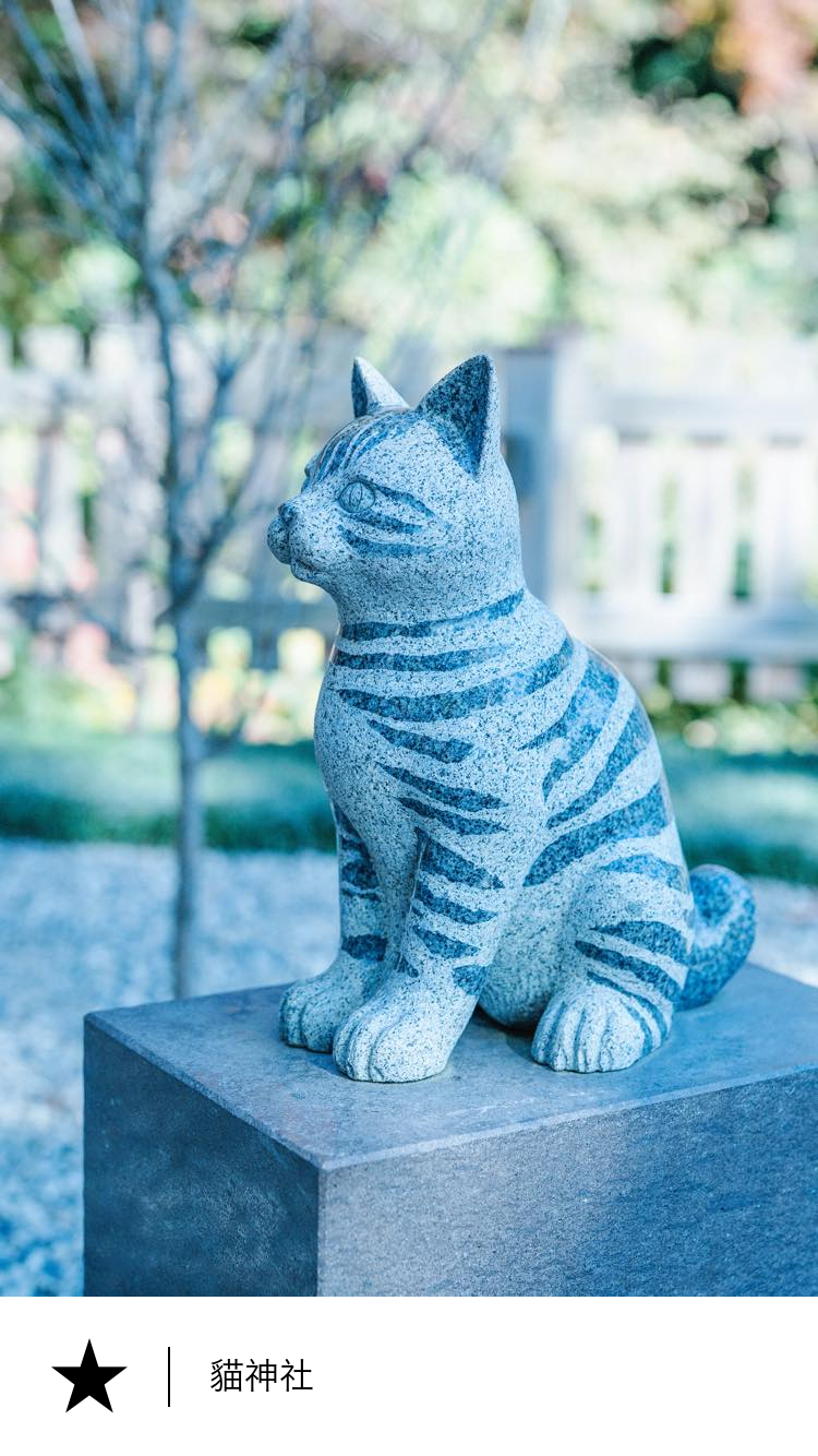 貓神社,最初位於鹿兒島城北端的護摩所內。明治維新後,島津家離開鹿兒島城時,神社也隨之遷至仙巖園內。2024年(令和6年)神社遷至現址,並在通往神社的參道上放置了悠閒自在的“導引貓”,並在神社內放置了“撫摸貓”。