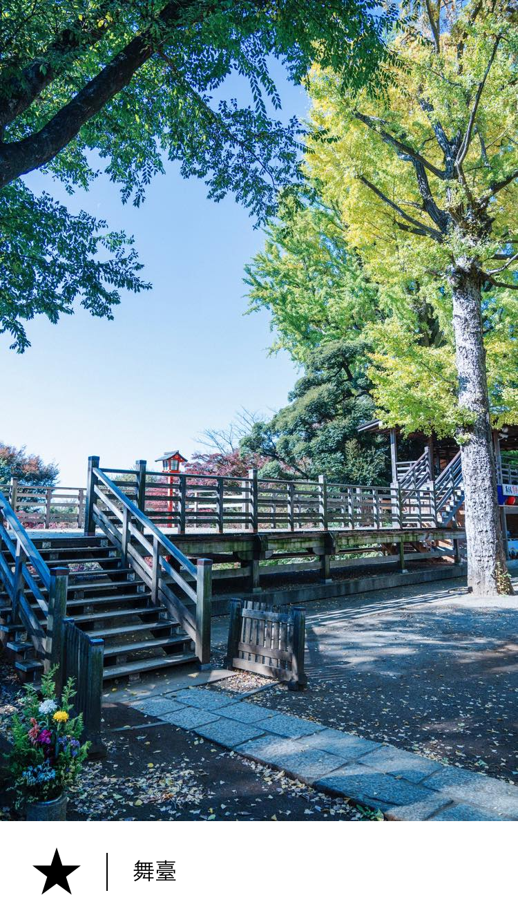 從這個舞臺上望去,晴天可以遠遠看見富士山。 眼前是平靜清澈的弁天池。這裡春天櫻花盛開,秋天紅葉盡染,被四季的色彩所環繞。 到了節分(驅鬼祈福)這天,這個舞臺就會變成熱鬧的祈福場所。每年2月,本命年的男女老少以及民眾會聚集于此,一同從這個舞臺上拋撒豆子驅邪納福。 人們一邊喊著“鬼出去,福進來”一邊撒豆子。伴隨著這聲呼喊拋撒的每一粒豆子,都是人們內心的期盼。在歡聲笑語中,人們感受著季節的更迭。
