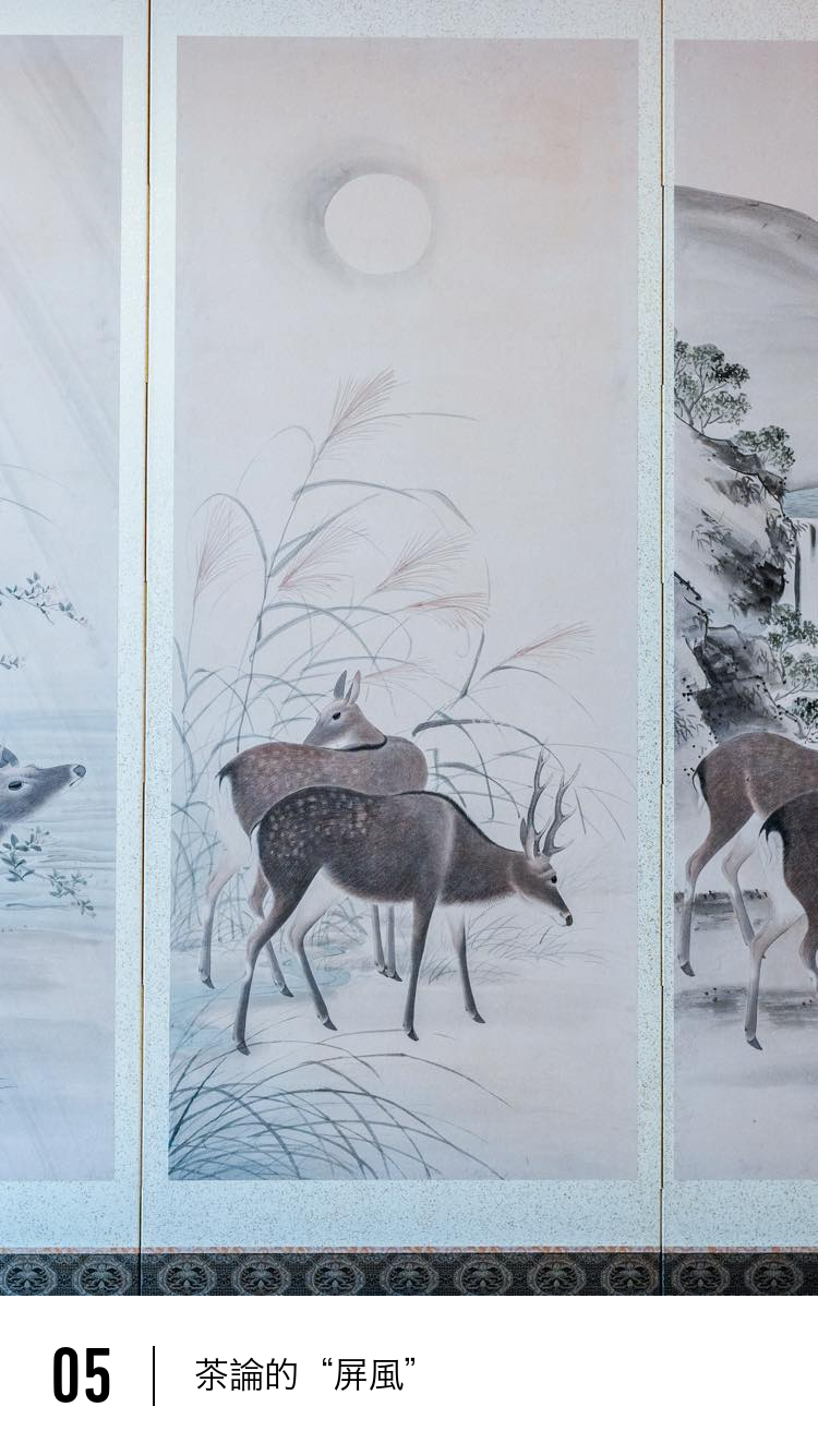 榻榻米大廳內,陳設著一面繪鹿的巨型屏風。