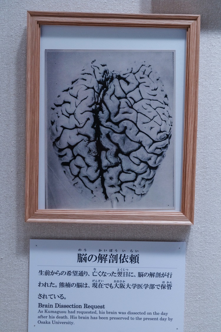 As requested in the “Request for Brain Analysis and Autopsy” document on display, after Kumagusu’s death his brain was removed and sent to Osaka University’s Medical School, where it remains preserved to this day. It is said that they found that the hippocampus in the inner part of his temporal lobe had atrophied. Perhaps that is where the madness of his genius had come from.