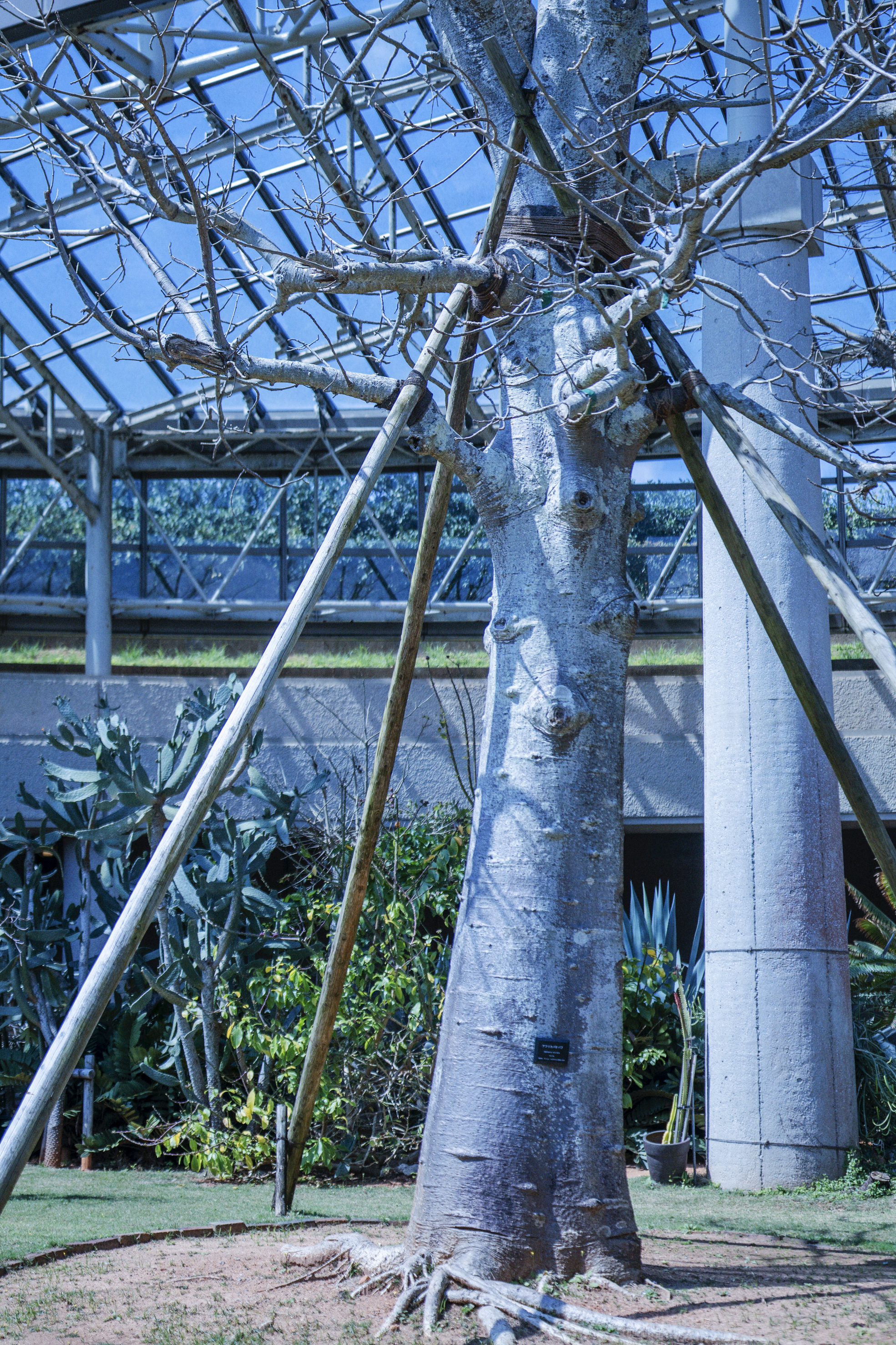 なかなか日本でお目にかかることはありませんが、熱帯ドリームセンターではこの場所で種から育った貴重なバオバブを見ることができます。手前が屋根の下で育ったバオバブ。奥が雨ざらしで育ったバオバブ。雨があたらない環境で育ったバオバブの方が、少し幹が太いことにお気づきでしょうか?